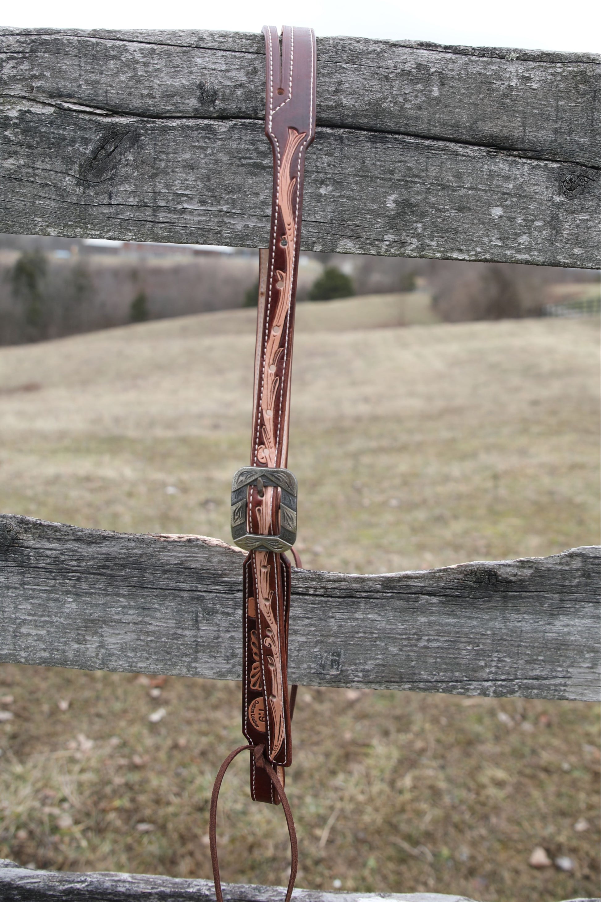 This headstall is fully tooled, featuring a one-ear slit and tapers. This design was drawn with the horse trader in mind. Maximizing adjustability allows for it to be utilized on a variety of horses. Why compromise looks for function when you can have both?
